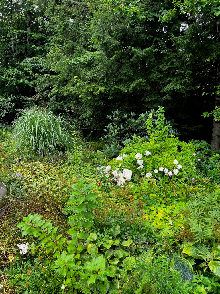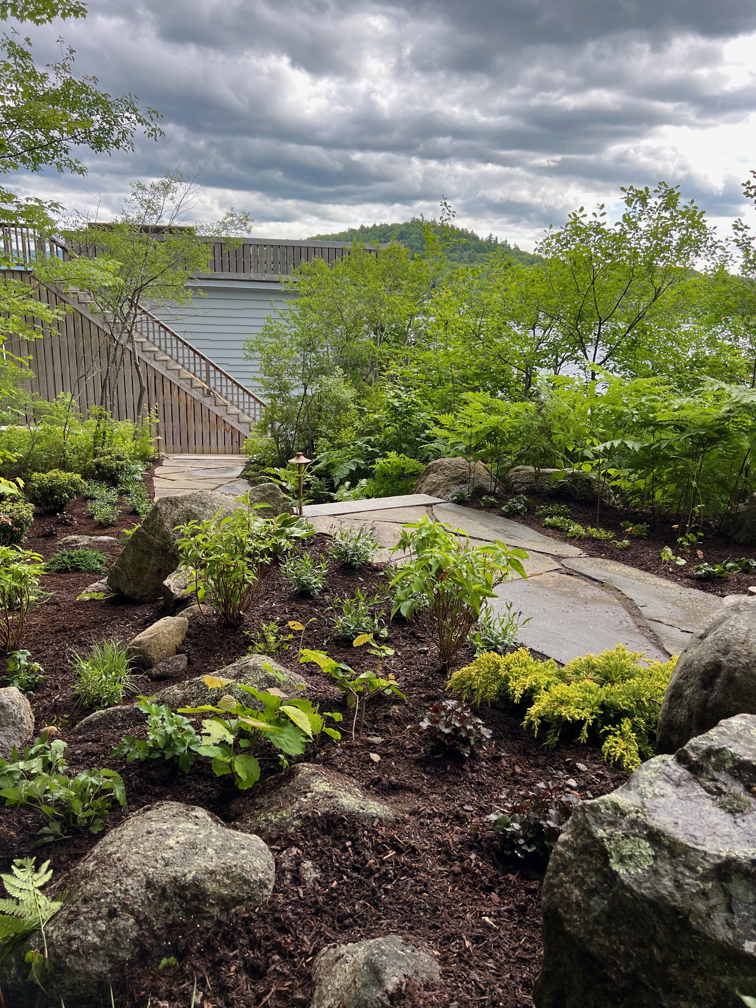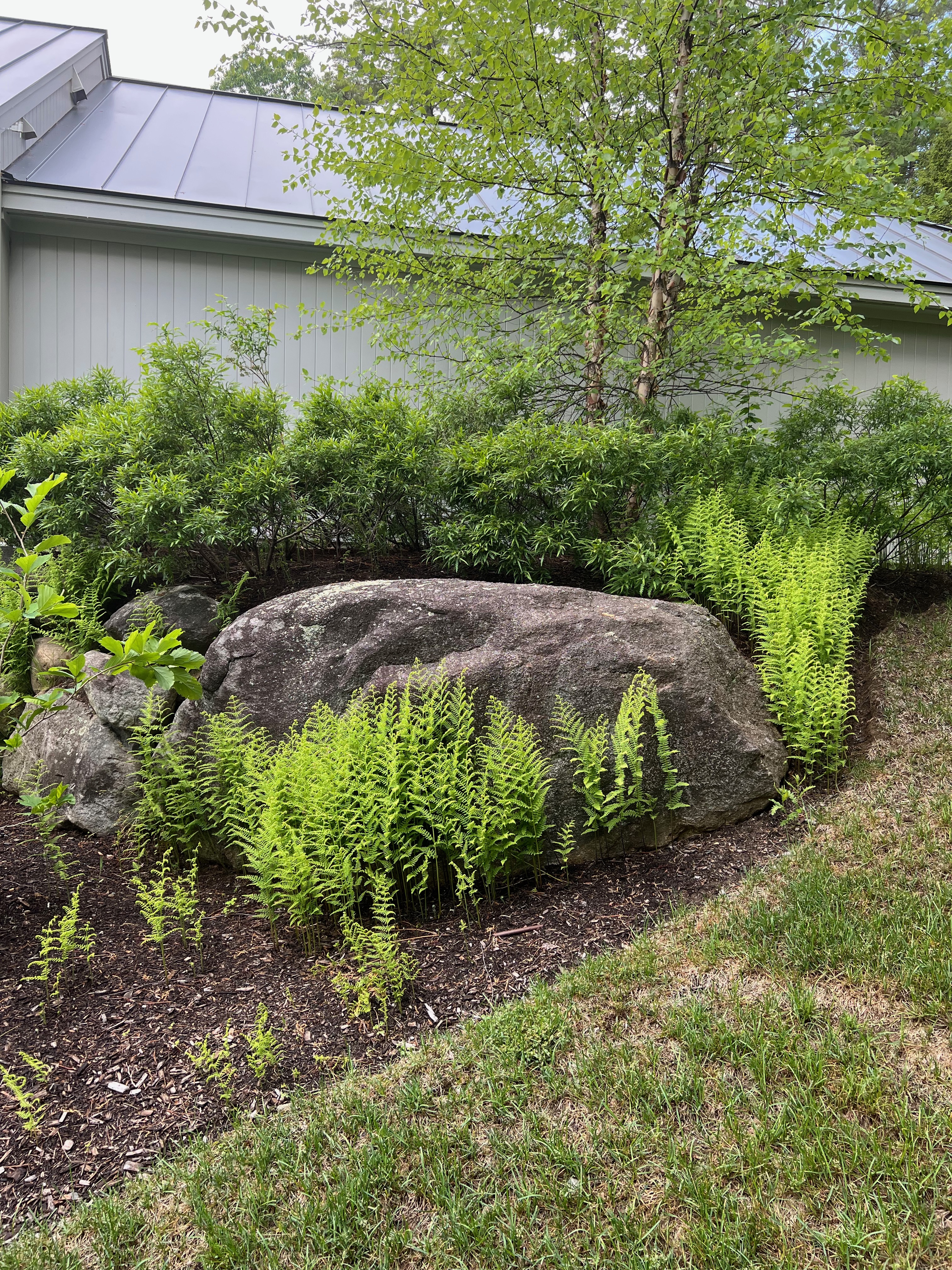 We almost completely cleared out this area, removing good plants to tarps for replanting, and getting rid of all the weeds and ferns for a fresh start. When the area was cleared out, we decided to add some new plants. The property had some amazing hosta, daylily, maidenhair fern, Rodgersia, and acidic loving shrubs like Mountain Laurel and Rhododendron, which became the backdrop for our new design.