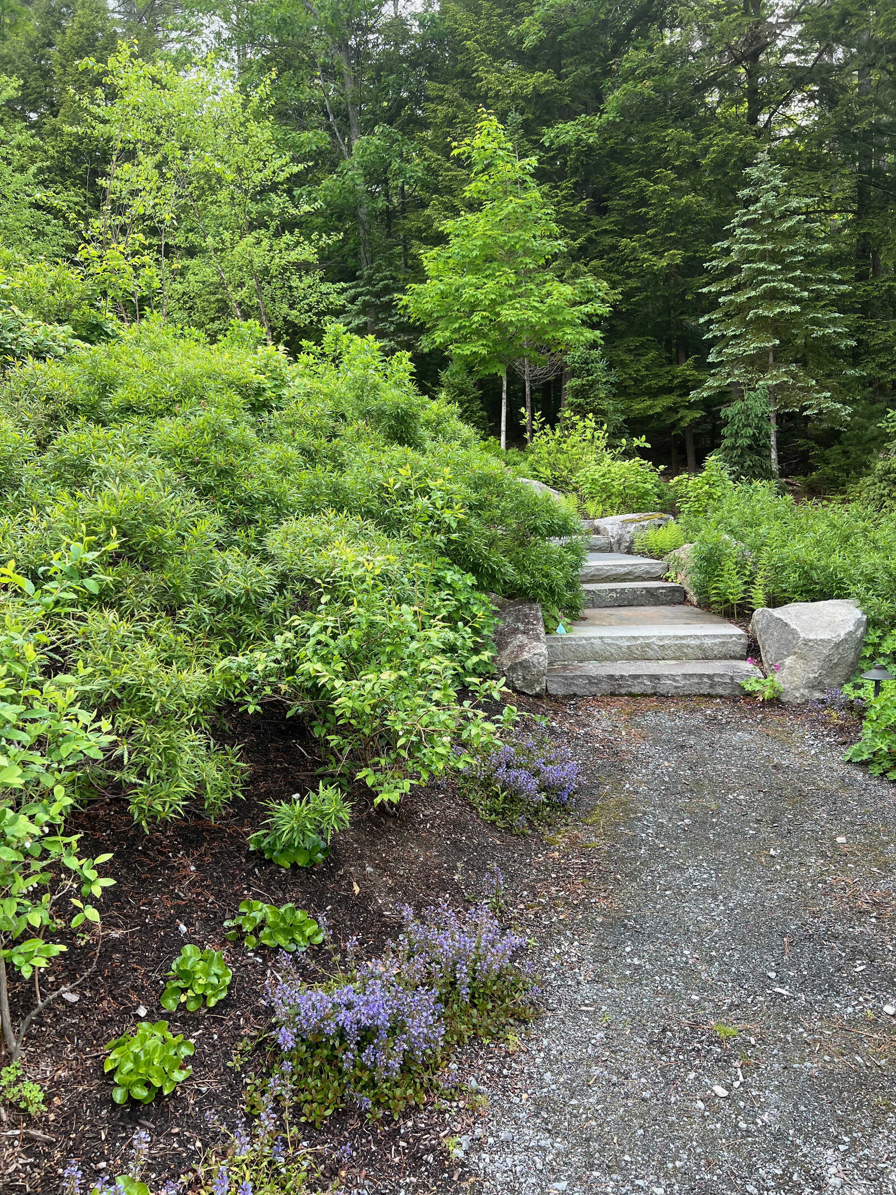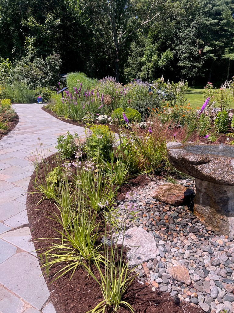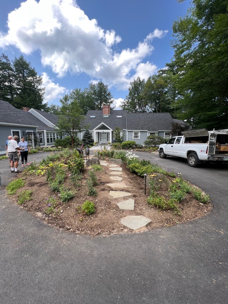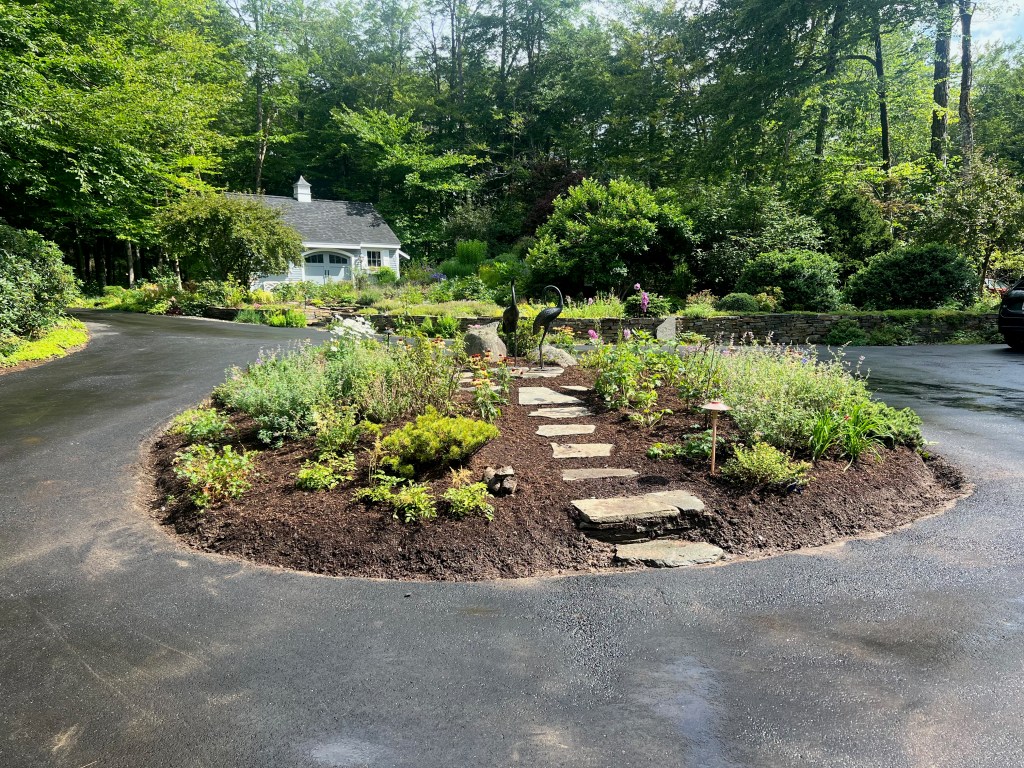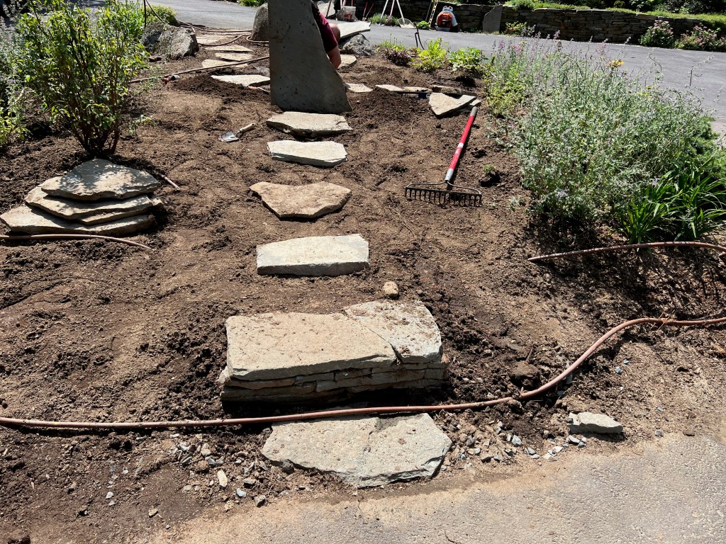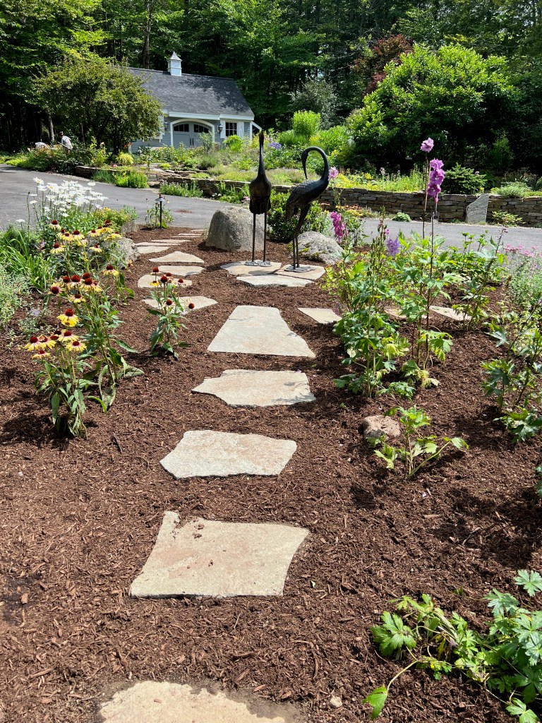 The center bed of this property was a highlight of our renovation and installation work there. We removed two overgrown shrubs, installed a walkway with steps, and also added a platform for sculpture. ThymeStone LLC assisted in our walkway and step installation.