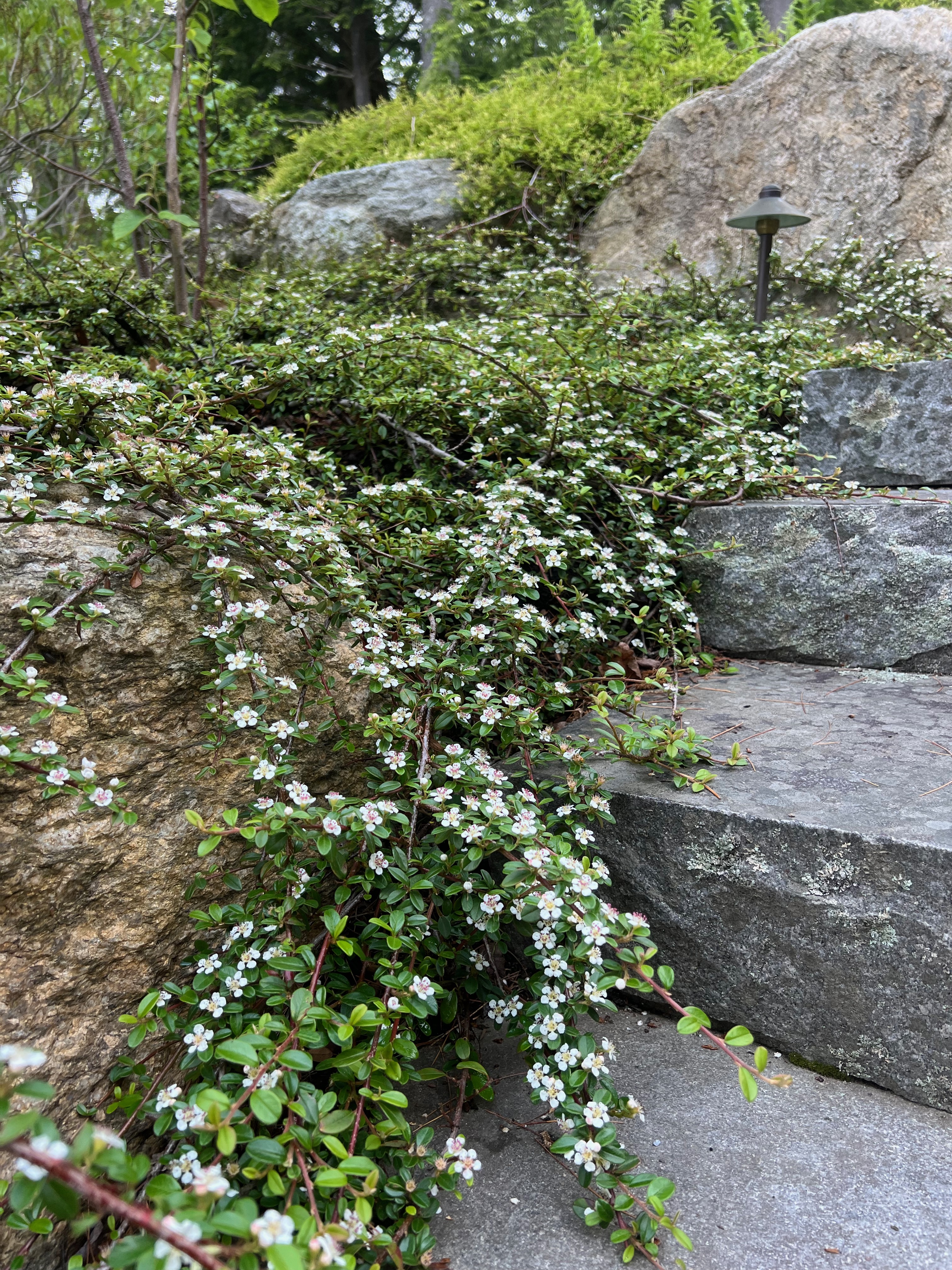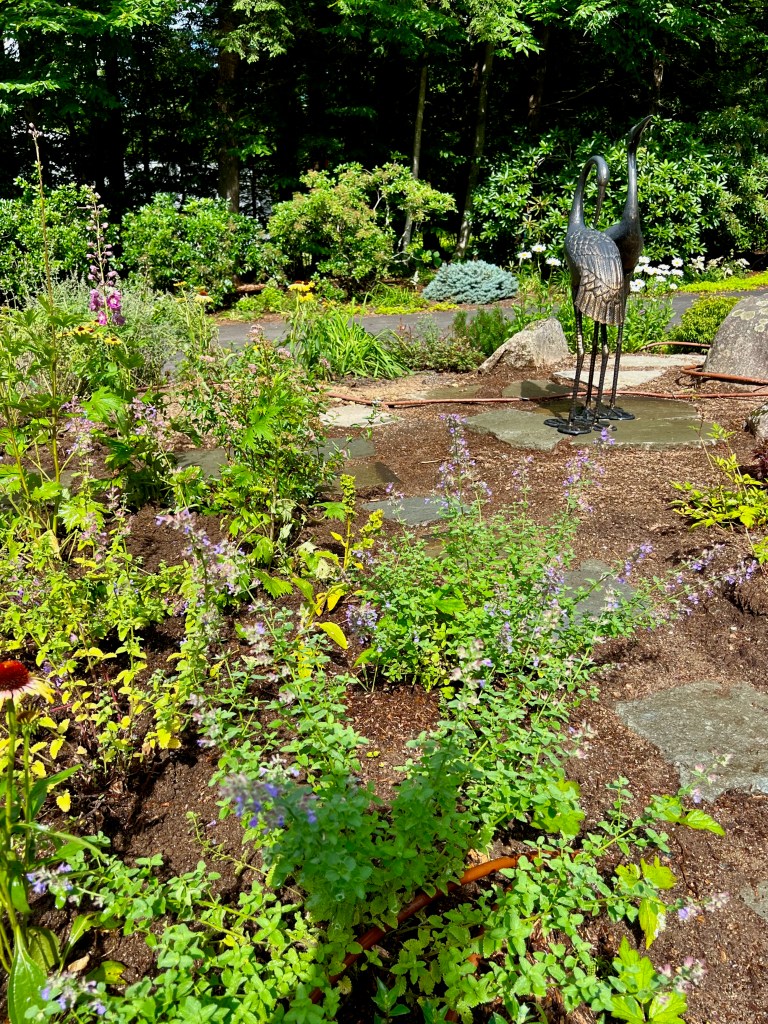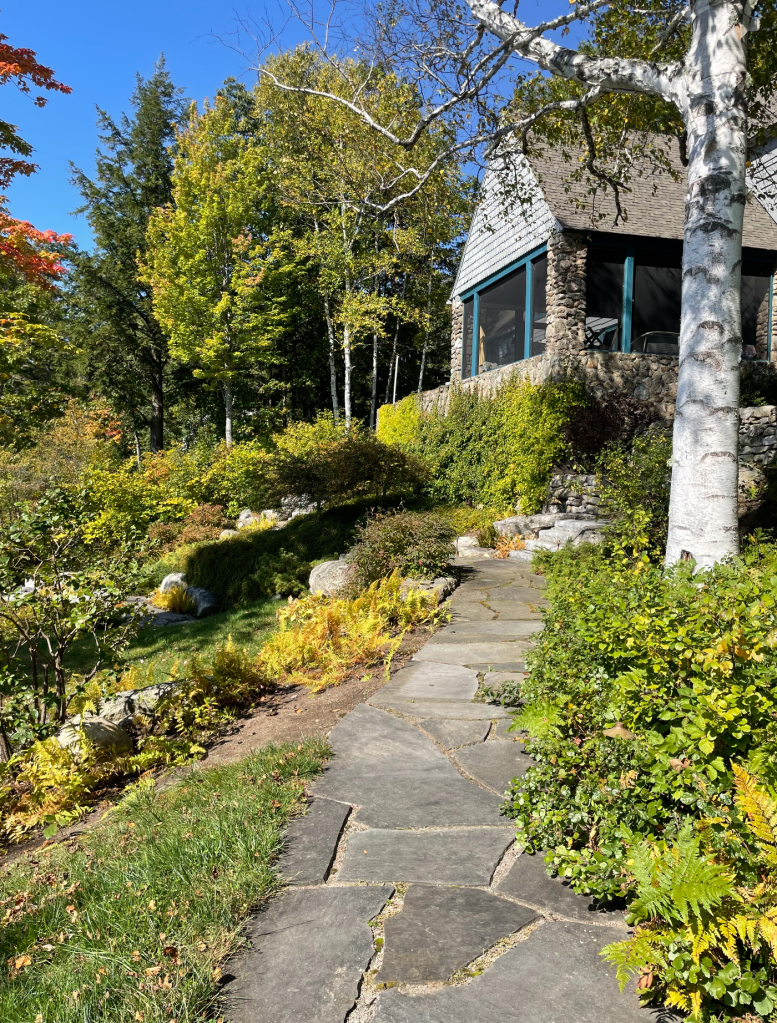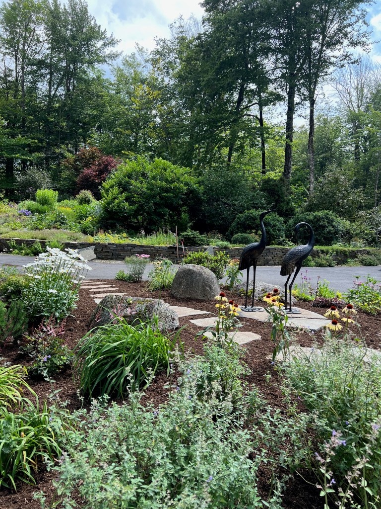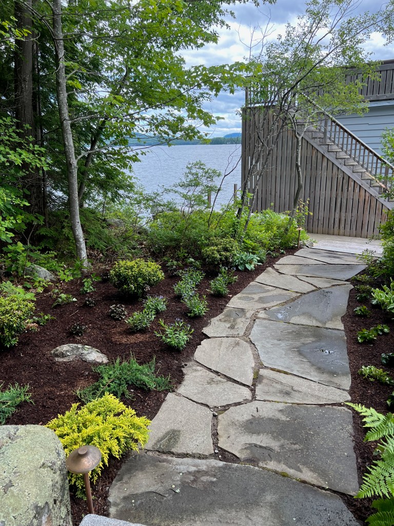 The center bed of this property was a highlight of our renovation and installation work there. We removed two overgrown shrubs, installed a walkway with steps, and also added a platform for sculpture. ThymeStone LLC assisted in our walkway and step installation.